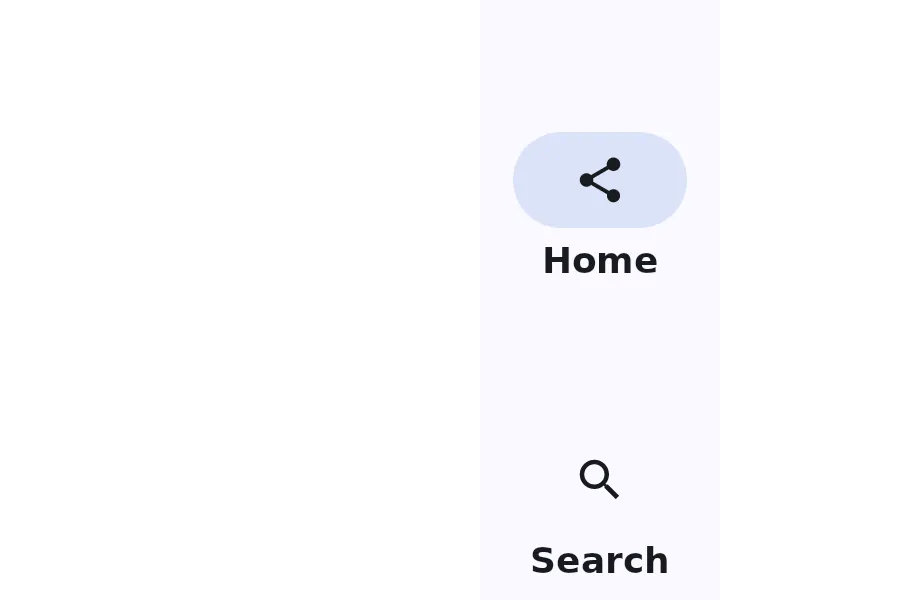 import { NavigationRail } from "@material";export component Example inherits Window { width: 400px; height: 300px; background: transparent; NavigationRail { width: 80px; height: parent.height; items: [ { icon: @image-url("../icons/share.svg"), text: "Home" }, { icon: @image-url("../icons/search.svg"), text: "Search" } ]; }}